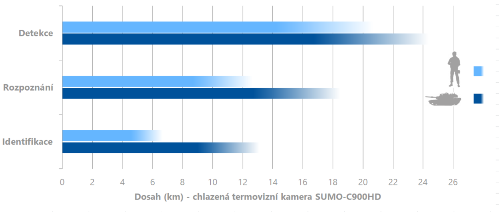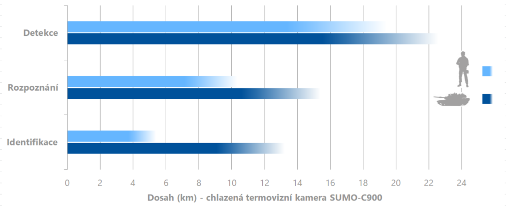 Kamera SUMO-C900 je vysoce citlivá chlazená termovizní kamera v pásmu středních vln, navržená pro integraci do širokého spektra aplikací s více senzory (např. elektro-optické systémy s radary, denními/nočními kamerami, světlomety, LRF, GPS apod.) Díky ostrému obrazu umožňuje termokamera SUMO-C900 detekovat lidský cíl na vzdálenost více než 19 km a termokamera SUMO-C900HD na více než 20 km.