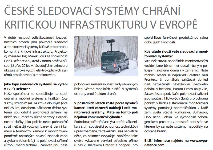 As part of our long-term cooperation with MS Line Publishing, we attended the Gala Meeting of the Representative Editorial Board and Friends of the Czech Defence and Security Industry Review and Review for AOBP, both of which are media platforms of the Czech Defence and Security Industry Association (AOBP). We are delighted that the current issue of both magazines includes a short article on our mobile surveillance systems that protect critical infrastructure across Europe.