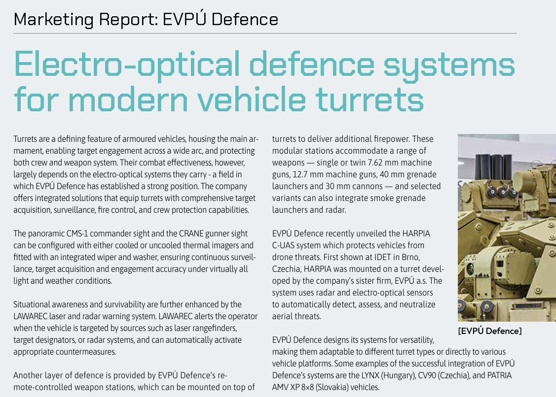 Prolistujte si nové vydání časopisu European Security & Defence a podívejte se, jak EVPÚ Defence díky svým špičkovým obranným systémům přispívá ke zvýšení schopností věží na bojových vozidlech. Naše integrovaná řešení poskytují posádkám bojových vozidel pokročilé technologie pro vyhledávání a sledování cílů, řízení palby i vlastní ochranu, a zajišťují tak mimořádnou operační efektivitu.